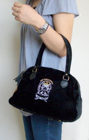 容量のたくさん入るバッグにして、持ち歩く時のかわいらしさも大事にしたいから、台形! ベロア素材と金銀刺繍、ゴールドメッキの金具をあわせてクラシカルに!