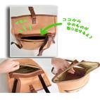 二つ折りフェイスが可愛い♪ショルダーポシェット。前面のギボシはダミーなのでマグホックでラクラク開閉☆被せ内側にはファスナーポケットがお目見え!背面のファスナーは中に通じているので、物の出し入れも簡単にできちゃいます!!