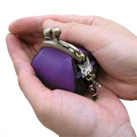 女性の手に収まる、小さな小さなサイズの小銭入れ。