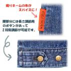 デニムの色に映える朱色の織りネームが効いてます! さらに、両方の腰部分には長さ調節の為のボタンがついていて、自分の体によりフィットさせられます。 使用されたボタンは全てダヤン印のオリジナルボタンです♪