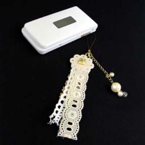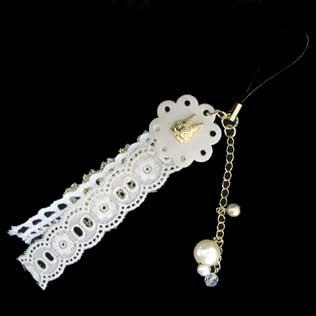 レースのあしらいと揺れるビーズが華やかなストラップ。