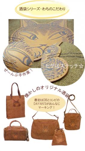 「どっかでみたことある!」って言う方も多いんではないでしょうか? 「酒袋」シリーズが最初に登場したのはちょうど10年前の1999年のこと。 酒袋とはお酒を絞る際に使う麻の袋のことです。その麹のつくるムラの風合いを見事に再現したプリント帆布と、オールドフェイスなダヤンラベルがポイントの人気シリーズ。 このポイントラベルは更にさかのぼって15年以上前のDAYAN'Sシリーズでも使われてたものなんです! それが10年の時を経て、CLシリーズとして再登場♪ 実は最初は「あまりにフルすぎる!」と反対の声もあったのですが、「今だからこそ!新しい!」と信じて疑わないデザイナーが断固主張。だって、こんな顔のダヤン、今では滅多にお目にかかれないですよ!「一度見たら忘れられない」今の人たちにも是非見せてあげましょうよ♪ ラベルはやっぱりこだわりきって、昔ながらのオール手染め!手馴れた職人技で、一個一個丁寧に凸部分を染色してます。ヒゲだって、ちゃーんとステッチではいってますヨ☆ その代わり、型は使用勝手とスタイルを重視!新しくて、懐かしい、2009年の酒袋です!
