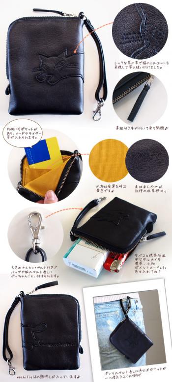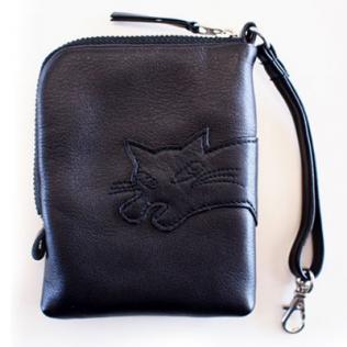 シックな黒の革で猫のシルエットを表現し丁寧に縫い付けました。