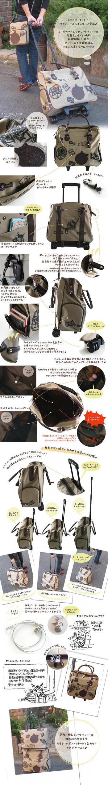 機内持ち込み可能なサイズのソフトタイプキャリーバッグが新登場!キャリーハンドル部分は収納可能。歩く時にはキャリーで、階段や機内ではショルダー使いで♪キャリー車輪は機動性のよい3輪タイプ。盗難防止用のホック引き手などこだわりも満載です。